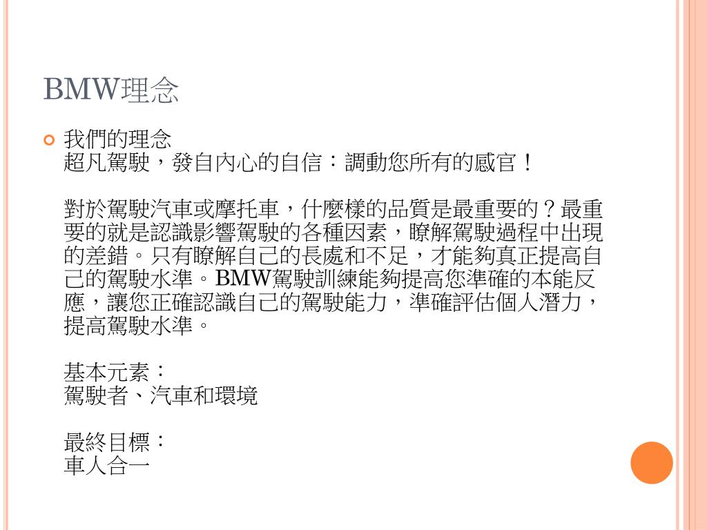 BMW理念 • 我們的理念 超凡駕駛,發自內心的自信:調動您所有的感官!對於駕駛汽車或摩托車,什麼樣的品質是最重要的?最重要的就是認識影響駕駛的各種因素,瞭解駕駛過程中出現的差錯。只有瞭解自己的長處和不足,才能夠真正提高自己的駕駛水準。BMW駕駛訓練能夠提高您準確的本能反應,讓您正確認識自己的駕駛能力,準確評估個人潛力,提高駕駛水準。基本元素:駕駛者、汽車和環境最終目標:車人合一