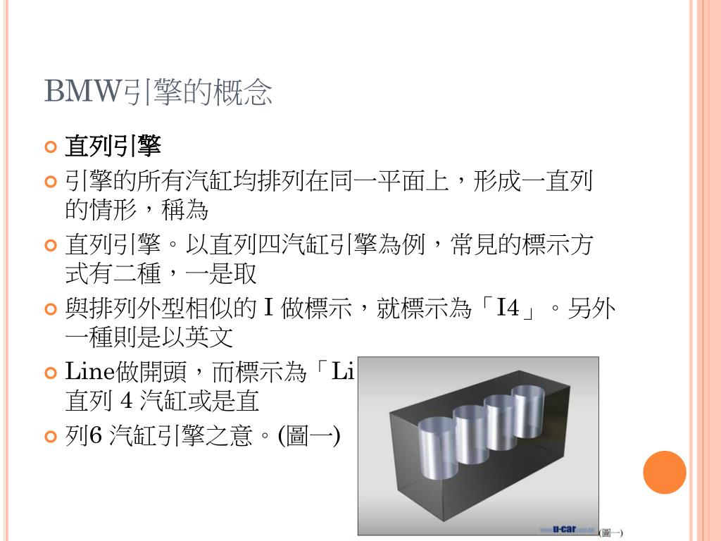 BMW引擎的概念 • 直列引擎 • 引擎的所有汽缸均排列在同一平面上,形成一直列的情形,稱為 • 直列引擎。以直列四汽缸引擎為例,常見的標示方式有二種,一是取 • 與排列外型相似的 I 做標示,就標示為「I4」。另外一種則是以英文 • Line做開頭,而標示為「Line 4」或「L6」以代表直列 4 汽缸或是直 • 列6 汽缸引擎之意。(圖一)