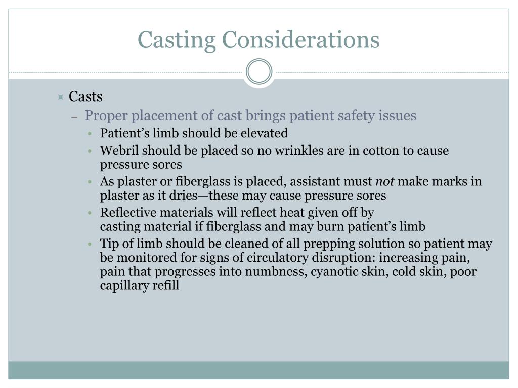 Casting Considerations • Casts • Proper placement of cast brings patient safety issues • Patient’s limb should be elevated • Webril should be placed so no wrinkles are in cotton to cause pressure sores • As plaster or fiberglass is placed, assistant must not make marks in plaster as it dries—these may cause pressure sores • Reflective materials will reflect heat given off by casting material if fiberglass and may burn patient’s limb • Tip of limb should be cleaned of all prepping solution so patient may be monitored for signs of circulatory disruption: increasing pain, pain that progresses into numbness, cyanotic skin, cold skin, poor capillary refill