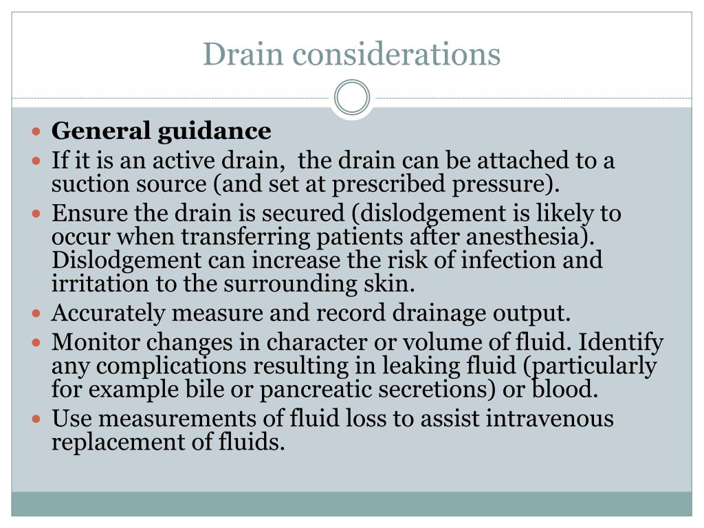 Drain considerations • General guidance • If it is an active drain, the drain can be attached to a suction source (and set at prescribed pressure). • Ensure the drain is secured (dislodgement is likely to occur when transferring patients after anesthesia). Dislodgement can increase the risk of infection and irritation to the surrounding skin. • Accurately measure and record drainage output. • Monitor changes in character or volume of fluid. Identify any complications resulting in leaking fluid (particularly for example bile or pancreatic secretions) or blood. • Use measurements of fluid loss to assist intravenous replacement of fluids.