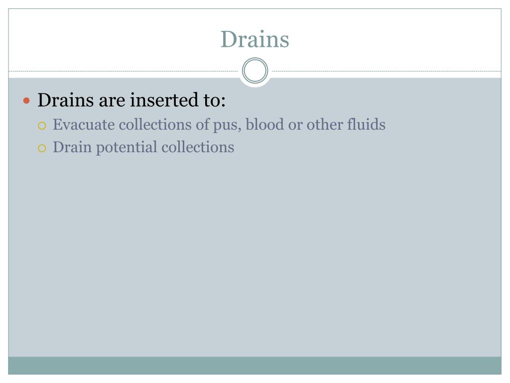 Drains • Drains are inserted to: • Evacuate collections of pus, blood or other fluids • Drain potential collections