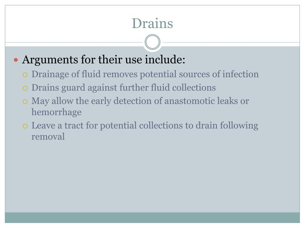 Drains • Arguments for their use include: • Drainage of fluid removes potential sources of infection • Drains guard against further fluid collections • May allow the early detection of anastomotic leaks or hemorrhage • Leave a tract for potential collections to drain following removal