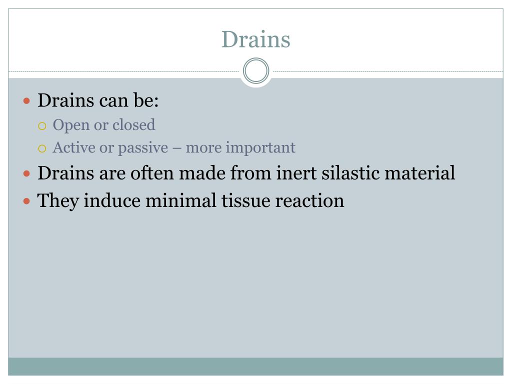 Drains • Drains can be: • Open or closed • Active or passive – more important • Drains are often made from inert silastic material • They induce minimal tissue reaction
