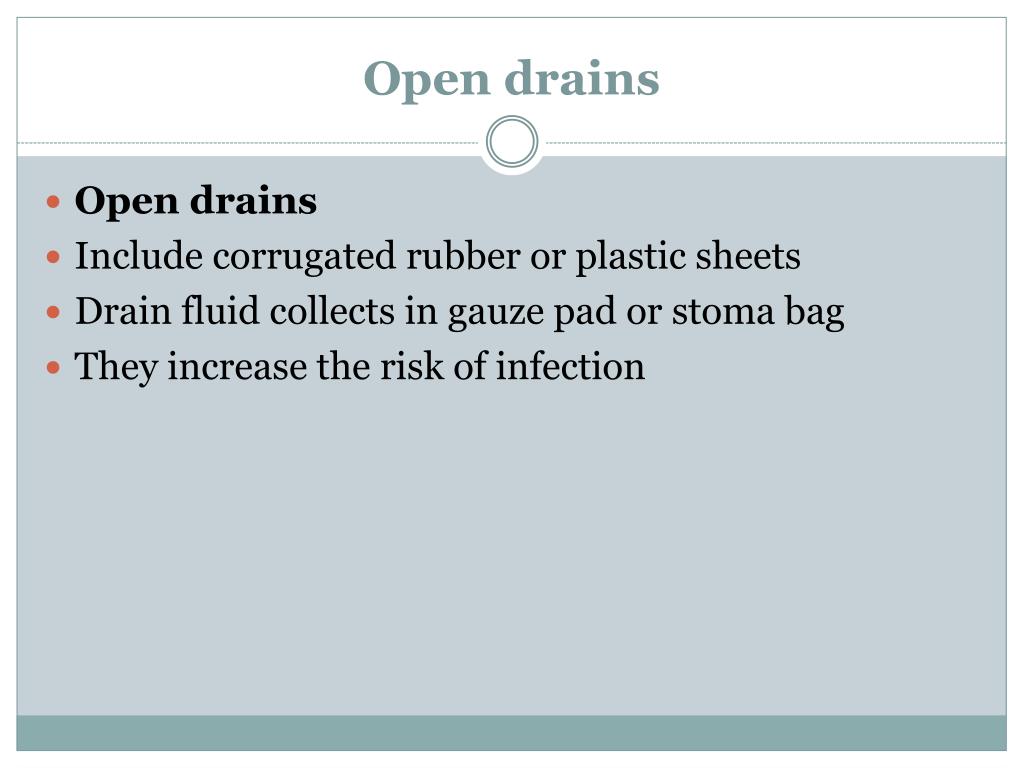 Open drains • Open drains • Include corrugated rubber or plastic sheets • Drain fluid collects in gauze pad or stoma bag • They increase the risk of infection