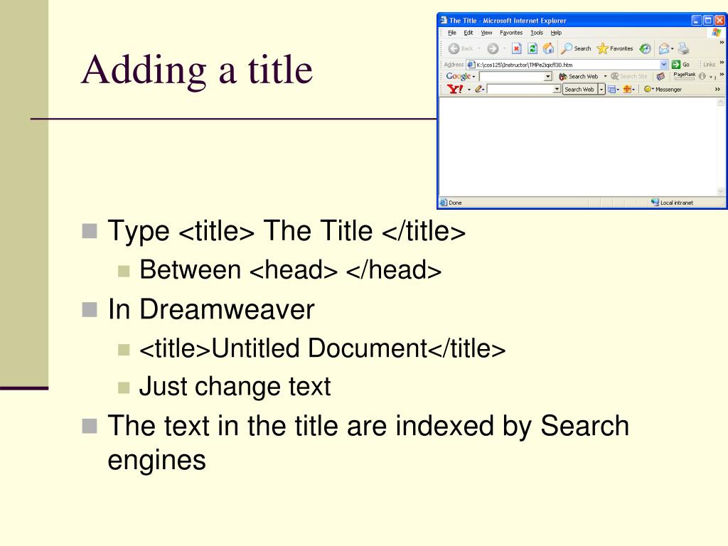 Adding a title • Type <title> The Title </title> • Between <head> </head> • In Dreamweaver • <title>Untitled Document</title> • Just change text • The text in the title are indexed by Search engines