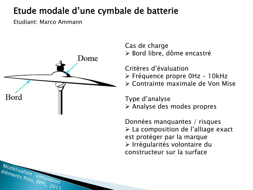 Etude modale d’une cymbale de batterie Etudiant: Marco Ammann • Cas de charge • Bord libre, dôme encastré • Critères d’évaluation • Fréquence propre 0Hz – 10kHz • Contrainte maximale de Von Mise • Type d’analyse • Analyse des modes propres • Données manquantes / risques • La composition de l’alliage exact est protéger par la marque • Irrégularités volontaire du constructeur sur la surface Modélisation /simulation éléments finis, EPFL, 2011
