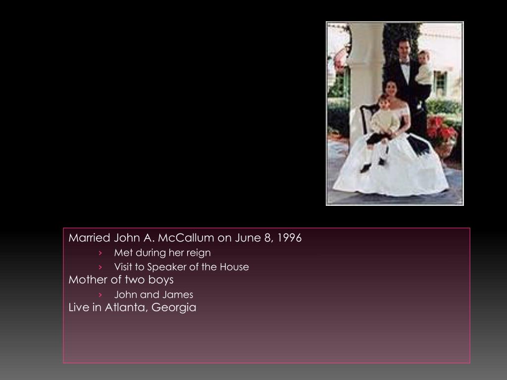 Married John A. McCallum on June 8, 1996 • Met during her reign • Visit to Speaker of the House Mother of two boys • John and James Live in Atlanta, Georgia