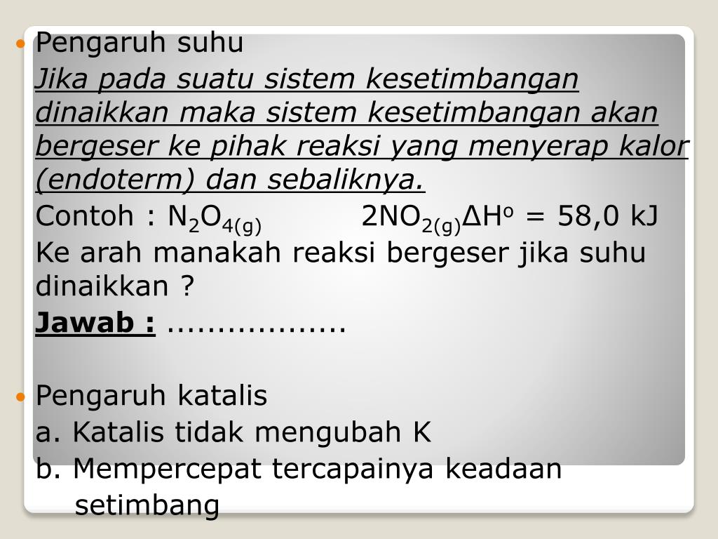 Pengaruh suhu Jika pada suatu sistem kesetimbangan dinaikkan maka sistem kesetimbangan akan bergeser ke pihak reaksi yang menyerap kalor (endoterm) dan sebaliknya. Contoh : N2O4(g) 2NO2(g)∆Ho = 58,0 kJ Ke arah manakah reaksi bergeser jika suhu dinaikkan ? Jawab : .................. • Pengaruh katalis a. Katalis tidak mengubah K b. Mempercepat tercapainya keadaan setimbang