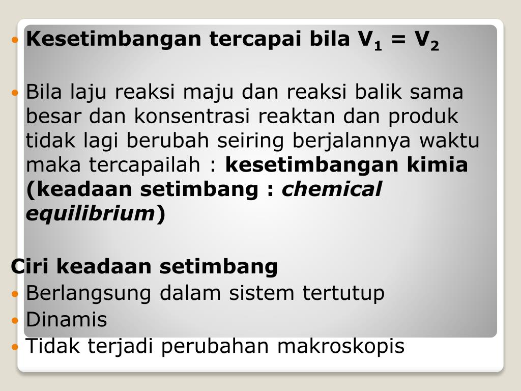 Kesetimbangan tercapai bila V1 = V2 • Bila laju reaksi maju dan reaksi balik sama besar dan konsentrasi reaktan dan produk tidak lagi berubah seiring berjalannya waktu maka tercapailah : kesetimbangan kimia (keadaan setimbang : chemical equilibrium) Ciri keadaan setimbang • Berlangsung dalam sistem tertutup • Dinamis • Tidak terjadi perubahan makroskopis