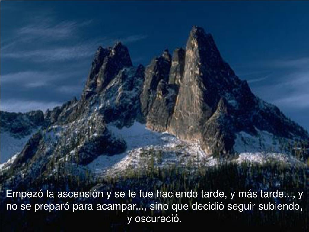 Empezó la ascensión y se le fue haciendo tarde, y más tarde..., y no se preparó para acampar..., sino que decidió seguir subiendo, y oscureció.