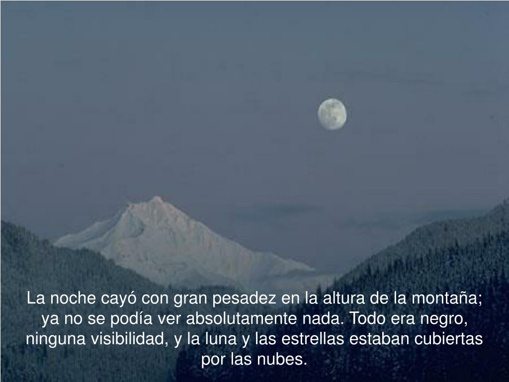 La noche cayó con gran pesadez en la altura de la montaña; ya no se podía ver absolutamente nada. Todo era negro, ninguna visibilidad, y la luna y las estrellas estaban cubiertas por las nubes.