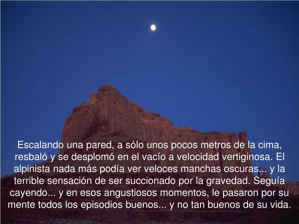 Escalando una pared, a sólo unos pocos metros de la cima, resbaló y se desplomó en el vacío a velocidad vertiginosa. El alpinista nada más podía ver veloces manchas oscuras... y la terrible sensación de ser succionado por la gravedad. Seguía cayendo... y en esos angustiosos momentos, le pasaron por su mente todos los episodios buenos... y no tan buenos de su vida.