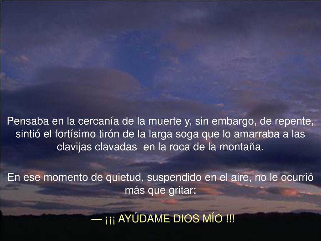 Pensaba en la cercanía de la muerte y, sin embargo, de repente, sintió el fortísimo tirón de la larga soga que lo amarraba a las clavijas clavadas en la roca de la montaña. En ese momento de quietud, suspendido en el aire, no le ocurrió más que gritar: — ¡¡¡ AYÚDAME DIOS MÍO !!!