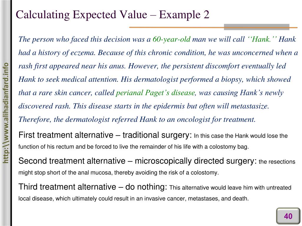 Calculating Expected Value – Example 2 The person who faced this decision was a 60-year-old man we will call ‘‘Hank.’’ Hank had a history of eczema. Because of this chronic condition, he was unconcerned when a rash first appeared near his anus. However, the persistent discomfort eventually led Hank to seek medical attention. His dermatologist performed a biopsy, which showed that a rare skin cancer, called perianal Paget’s disease, was causing Hank’s newly discovered rash. This disease starts in the epidermis but often will metastasize. Therefore, the dermatologist referred Hank to an oncologist for treatment. First treatment alternative – traditional surgery: In this case the Hank would lose the function of his rectum and be forced to live the remainder of his life with a colostomy bag. Second treatment alternative – microscopically directed surgery: the resections might stop short of the anal mucosa, thereby avoiding the risk of a colostomy. Third treatment alternative – do nothing: This alternative would leave him with untreated local disease, which ultimately could result in an invasive cancer, metastases, and death.