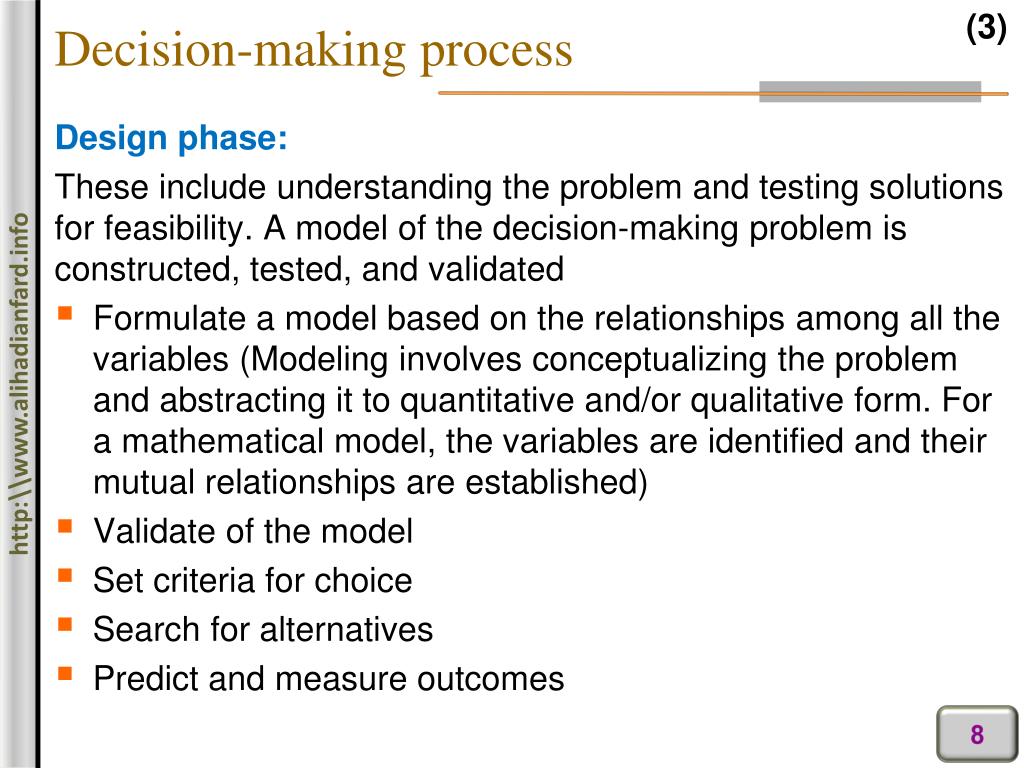 Decision-making process (3) Design phase: These include understanding the problem and testing solutions for feasibility. A model of the decision-making problem is constructed, tested, and validated Formulate a model based on the relationships among all the variables (Modeling involves conceptualizing the problem and abstracting it to quantitative and/or qualitative form. For a mathematical model, the variables are identified and their mutual relationships are established) Validate of the model Set criteria for choice Search for alternatives Predict and measure outcomes