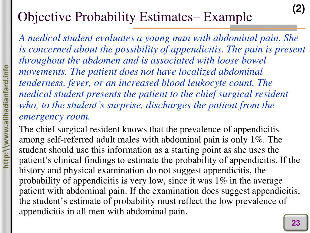 Objective Probability Estimates– Example (2) A medical student evaluates a young man with abdominal pain. She is concerned about the possibility of appendicitis. The pain is present throughout the abdomen and is associated with loose bowel movements. The patient does not have localized abdominal tenderness, fever, or an increased blood leukocyte count. The medical student presents the patient to the chief surgical resident who, to the student’s surprise, discharges the patient from the emergency room. The chief surgical resident knows that the prevalence of appendicitis among self-referred adult males with abdominal pain is only 1%. The student should use this information as a starting point as she uses the patient’s clinical findings to estimate the probability of appendicitis. If the history and physical examination do not suggest appendicitis, the probability of appendicitis is very low, since it was 1% in the average patient with abdominal pain. If the examination does suggest appendicitis, the student’s estimate of probability must reflect the low prevalence of appendicitis in all men with abdominal pain.