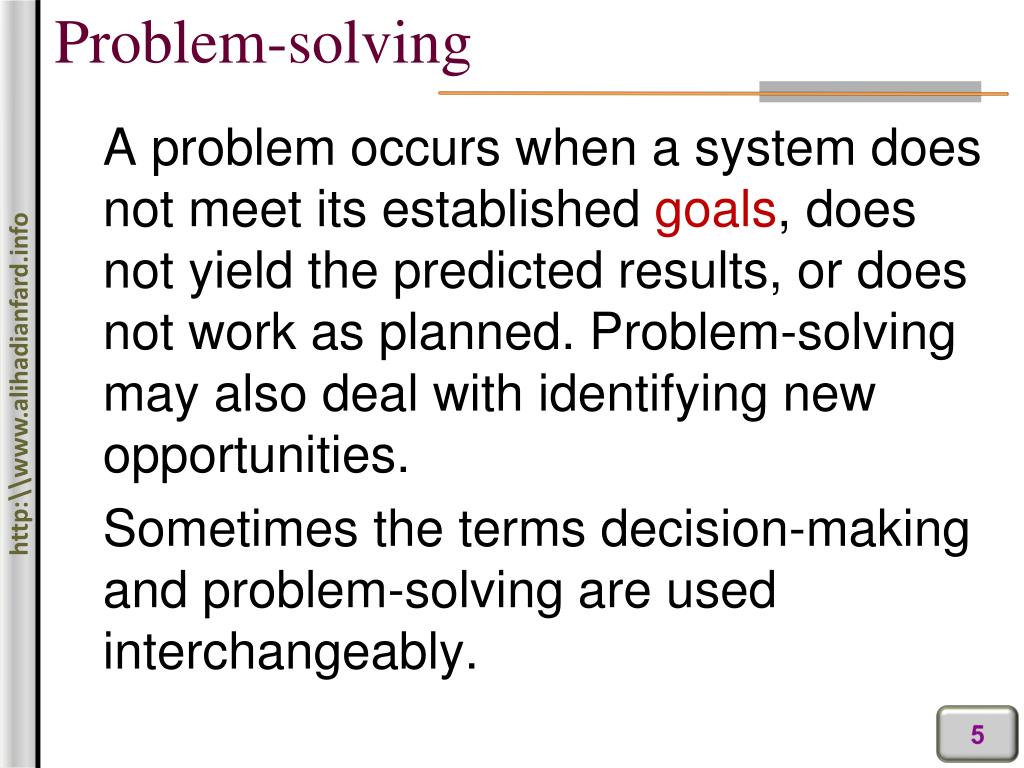 Problem-solving A problem occurs when a system does not meet its established goals, does not yield the predicted results, or does not work as planned. Problem-solving may also deal with identifying new opportunities. Sometimes the terms decision-making and problem-solving are used interchangeably.