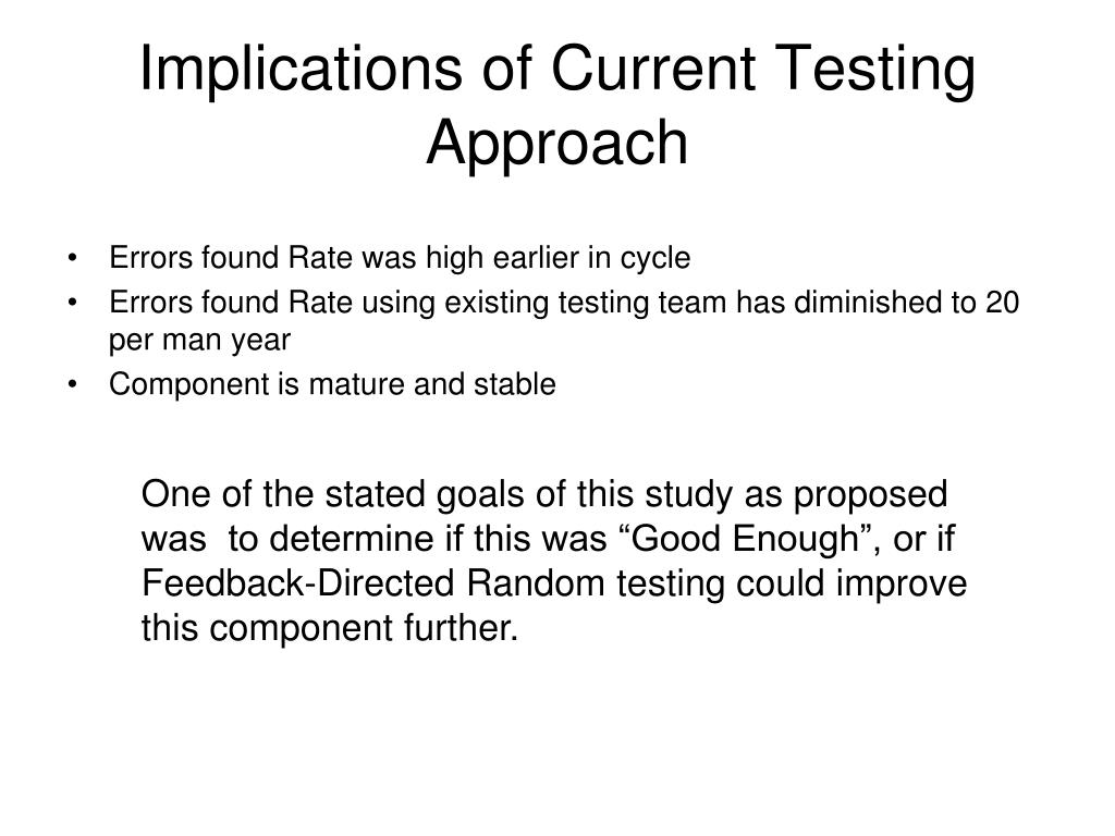 Implications of Current Testing Approach • Errors found Rate was high earlier in cycle • Errors found Rate using existing testing team has diminished to 20 per man year • Component is mature and stable One of the stated goals of this study as proposed was to determine if this was “Good Enough”, or if Feedback-Directed Random testing could improve this component further.