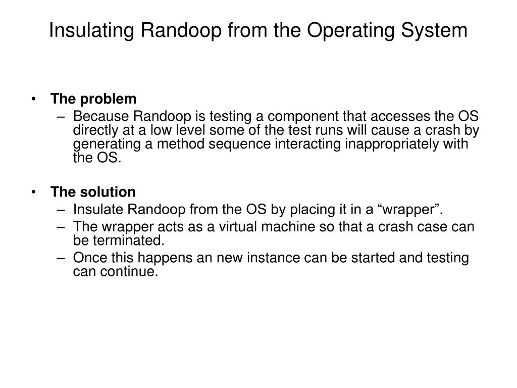 Insulating Randoop from the Operating System • The problem • Because Randoop is testing a component that accesses the OS directly at a low level some of the test runs will cause a crash by generating a method sequence interacting inappropriately with the OS. • The solution • Insulate Randoop from the OS by placing it in a “wrapper”. • The wrapper acts as a virtual machine so that a crash case can be terminated. • Once this happens an new instance can be started and testing can continue.