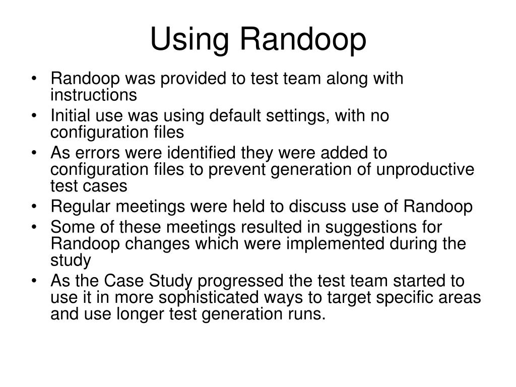 Using Randoop • Randoop was provided to test team along with instructions • Initial use was using default settings, with no configuration files • As errors were identified they were added to configuration files to prevent generation of unproductive test cases • Regular meetings were held to discuss use of Randoop • Some of these meetings resulted in suggestions for Randoop changes which were implemented during the study • As the Case Study progressed the test team started to use it in more sophisticated ways to target specific areas and use longer test generation runs.