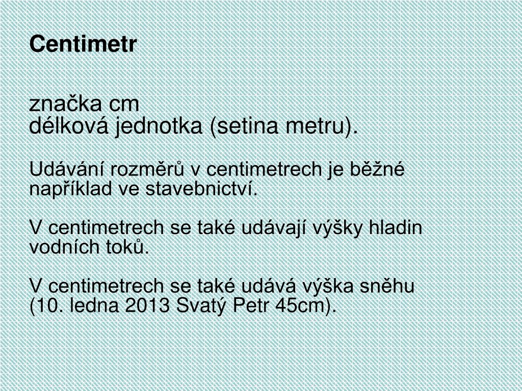 Centimetr • značka cmdélková jednotka (setina metru). • Udávání rozměrů v centimetrech je běžné například ve stavebnictví. V centimetrech se také udávají výšky hladin vodních toků. • V centimetrech se také udává výška sněhu(10. ledna 2013 Svatý Petr 45cm).