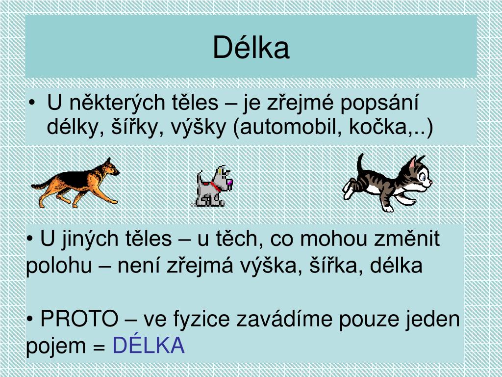 Délka • U některých těles – je zřejmé popsání délky, šířky, výšky (automobil, kočka,..) • U jiných těles – u těch, co mohou změnit polohu – není zřejmá výška, šířka, délka • PROTO – ve fyzice zavádíme pouze jeden pojem = DÉLKA