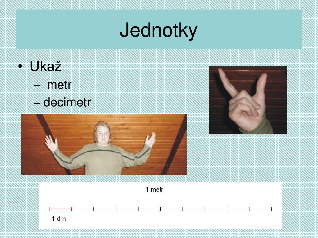 Nanometr • značka nmdélková jednotka (miliardtina metru). • vzdálenosti atomů v pevných látkách jsou řádově zlomky nanometrů. • Centimetr • Centimetr (značka cm) je délková jednotka, 10-2 neboli 1 setina metru. • Udávání rozměrů v centimetrech je běžné například ve stavebnictví. V centimetrech se také udávají výšky hladin vodních toků.