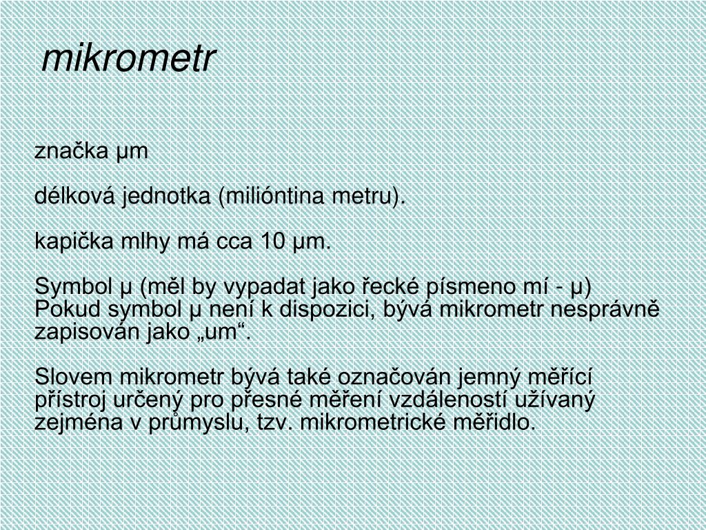 mikrometr • značka µm • délková jednotka (milióntina metru). • kapička mlhy má cca 10 µm. • Symbol µ (měl by vypadat jako řecké písmeno mí - μ)Pokud symbol µ není k dispozici, bývá mikrometr nesprávně zapisován jako „um“. • Slovem mikrometr bývá také označován jemný měřící přístroj určený pro přesné měření vzdáleností užívaný zejména v průmyslu, tzv. mikrometrické měřidlo.