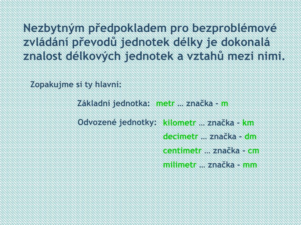 Nezbytným předpokladem pro bezproblémové zvládání převodů jednotek délky je dokonalá znalost délkových jednotek a vztahů mezi nimi. Zopakujme si ty hlavní: Základní jednotka: metr … značka - m Odvozené jednotky: kilometr … značka - km decimetr … značka - dm centimetr … značka - cm milimetr … značka - mm