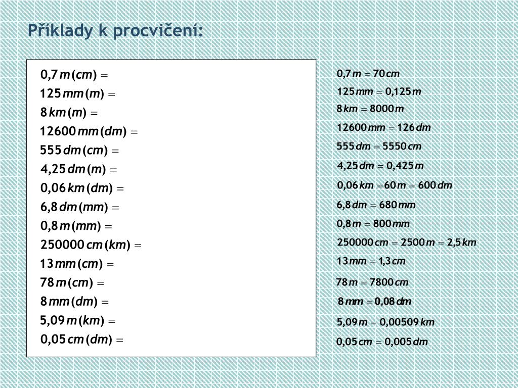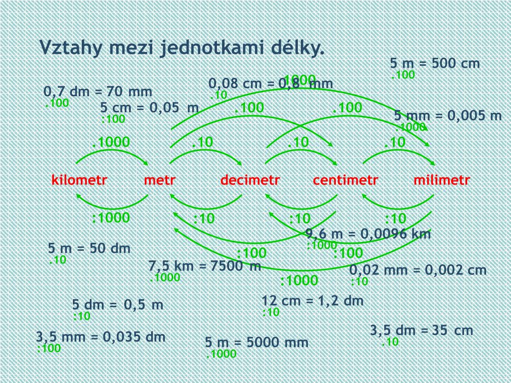 .1000 .100 .100 .1000 .10 .10 .10 :1000 :10 :10 :10 :100 :100 :1000 Vztahy mezi jednotkami délky. 5 m = cm 500 .100 0,08 cm = mm 0,8 0,7 dm = mm 70 .10 .100 5 cm = m 0,05 5 mm = m 0,005 :100 :1000 kilometr metr decimetr centimetr milimetr 9,6 m = km 0,0096 :1000 5 m = dm 50 .10 7,5 km = m 7500 0,02 mm = cm 0,002 .1000 :10 12 cm = dm 1,2 5 dm = m 0,5 :10 :10 3,5 dm = cm 35 3,5 mm = dm 0,035 .10 5 m = mm 5000 :100 .1000