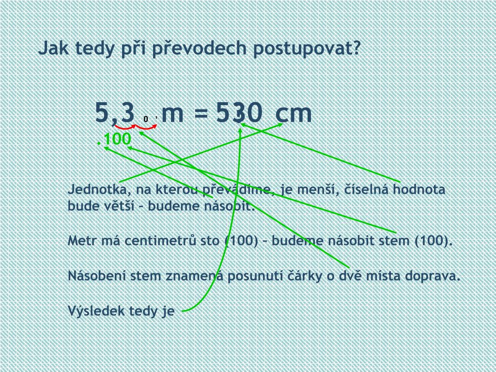 Jak tedy při převodech postupovat? 5,3 m = cm 530 ? , 0 . 100 Jednotka, na kterou převádíme, je menší, číselná hodnota bude větší – budeme násobit. Metr má centimetrů sto (100) – budeme násobit stem (100). Násobení stem znamená posunutí čárky o dvě místa doprava. Výsledek tedy je