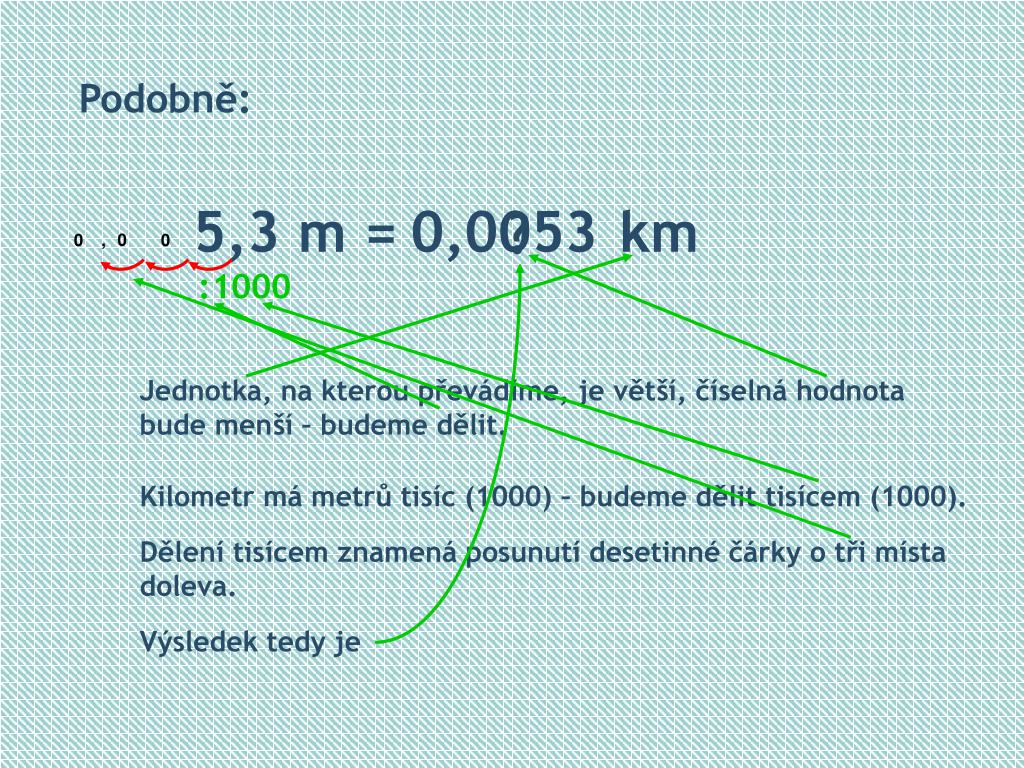 Podobně: 5,3 m = km 0,0053 ? 0 0 , 0 : 1000 Jednotka, na kterou převádíme, je větší, číselná hodnota bude menší – budeme dělit. Kilometr má metrů tisíc (1000) – budeme dělit tisícem (1000). Dělení tisícem znamená posunutí desetinné čárky o tři místa doleva. Výsledek tedy je