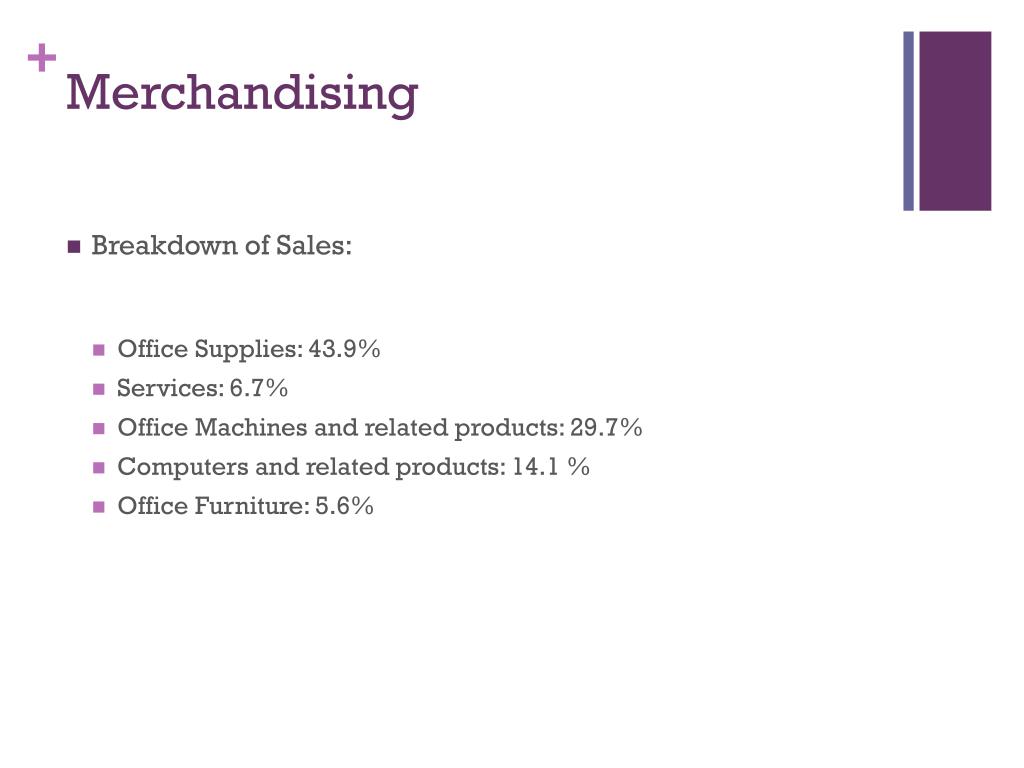 Merchandising • Breakdown of Sales: • Office Supplies: 43.9% • Services: 6.7% • Office Machines and related products: 29.7% • Computers and related products: 14.1 % • Office Furniture: 5.6%