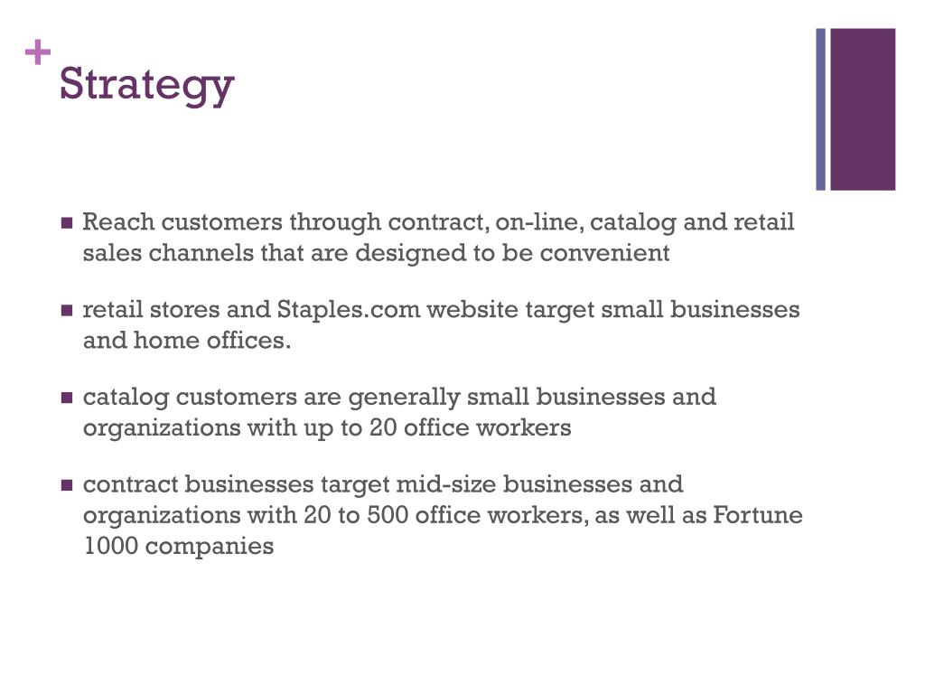 Strategy • Reach customers through contract, on-line, catalog and retail sales channels that are designed to be convenient • retail stores and Staples.com website target small businesses and home offices. • catalog customers are generally small businesses and organizations with up to 20 office workers • contract businesses target mid-size businesses and organizations with 20 to 500 office workers, as well as Fortune 1000 companies