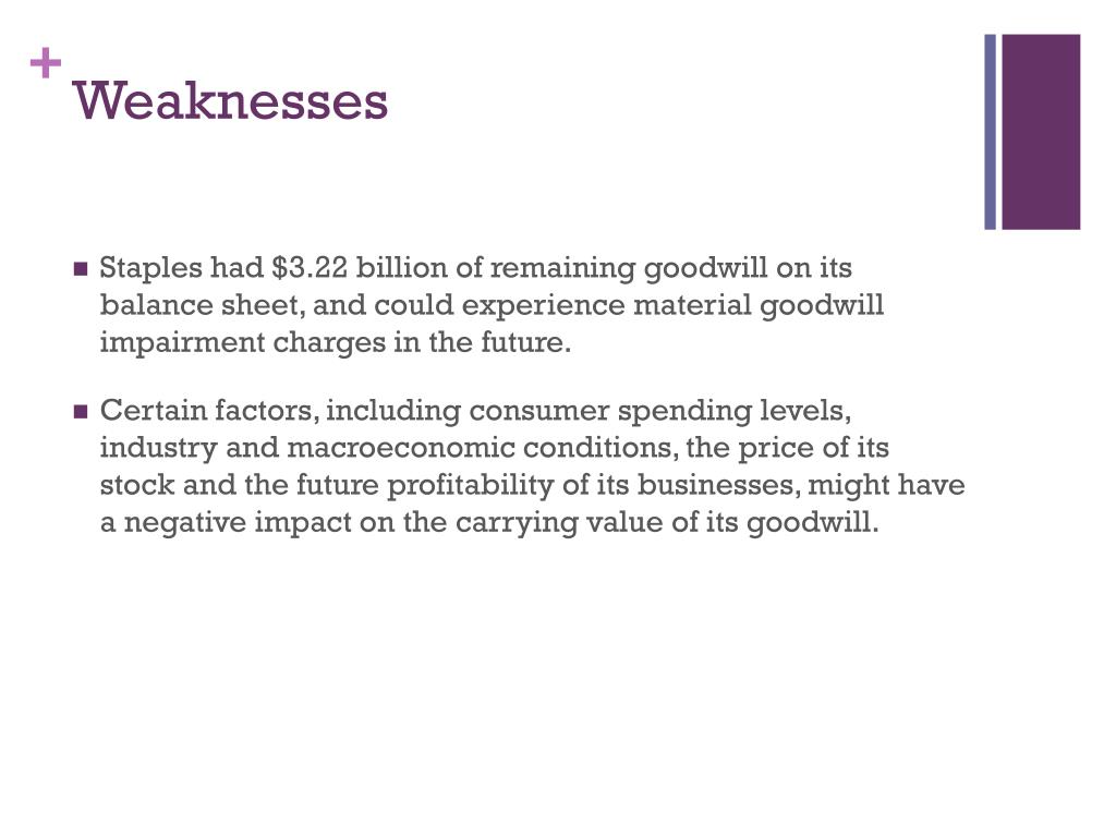 Weaknesses • Staples had $3.22 billion of remaining goodwill on its balance sheet, and could experience material goodwill impairment charges in the future. • Certain factors, including consumer spending levels, industry and macroeconomic conditions, the price of its stock and the future profitability of its businesses, might have a negative impact on the carrying value of its goodwill.