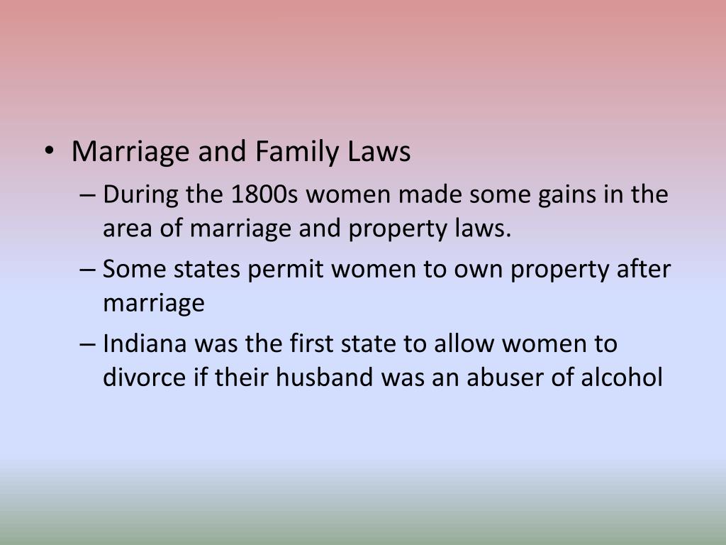 Marriage and Family Laws • During the 1800s women made some gains in the area of marriage and property laws. • Some states permit women to own property after marriage • Indiana was the first state to allow women to divorce if their husband was an abuser of alcohol