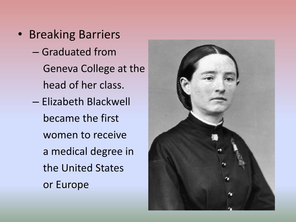 Breaking Barriers • Graduated from Geneva College at the head of her class. • Elizabeth Blackwell became the first women to receive a medical degree in the United States or Europe
