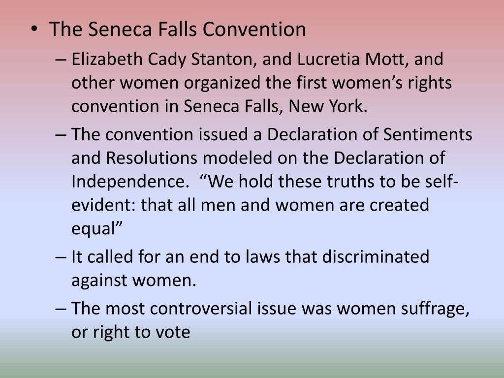 The Seneca Falls Convention • Elizabeth Cady Stanton, and Lucretia Mott, and other women organized the first women’s rights convention in Seneca Falls, New York. • The convention issued a Declaration of Sentiments and Resolutions modeled on the Declaration of Independence. “We hold these truths to be self-evident: that all men and women are created equal” • It called for an end to laws that discriminated against women. • The most controversial issue was women suffrage, or right to vote
