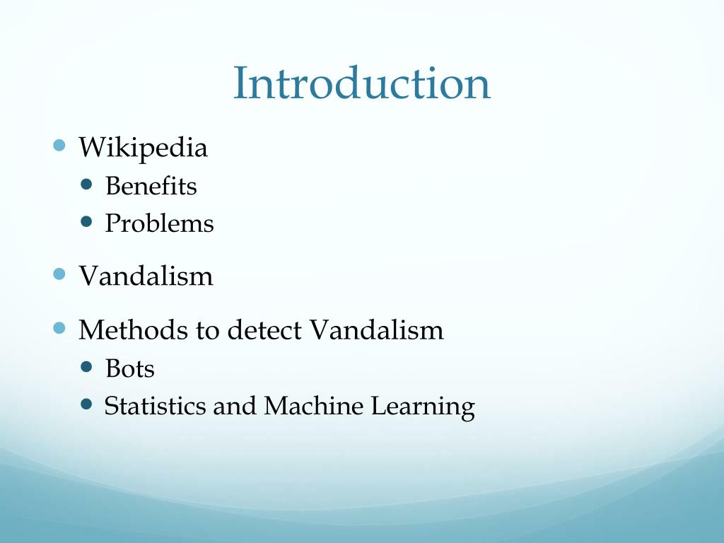 Introduction • Wikipedia • Benefits • Problems • Vandalism • Methods to detect Vandalism • Bots • Statistics and Machine Learning