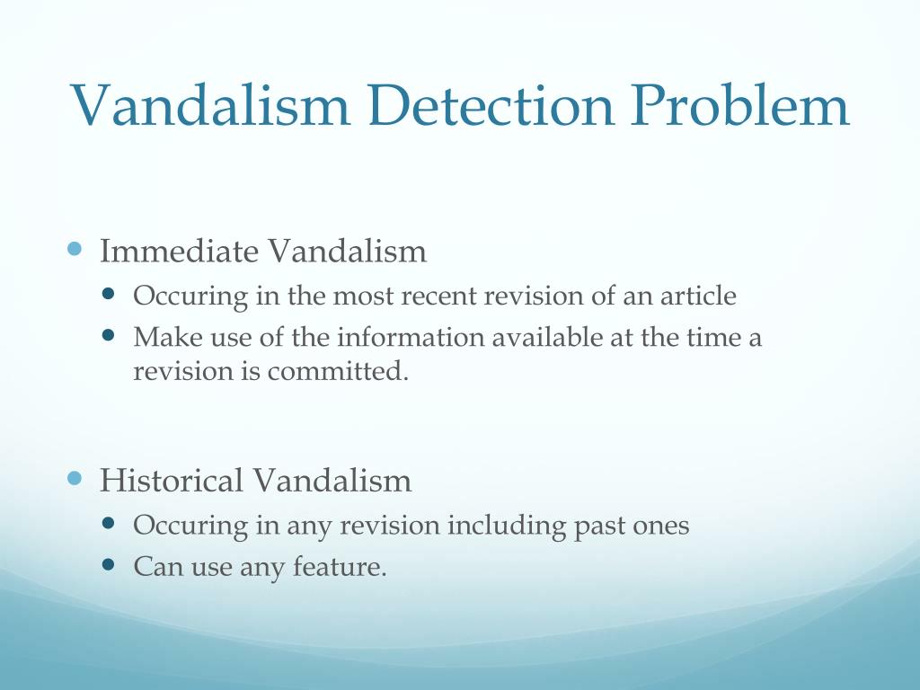 Vandalism Detection Problem • Immediate Vandalism • Occuring in the most recent revision of an article • Make use of the information available at the time a revision is committed. • Historical Vandalism • Occuring in any revision including past ones • Can use any feature.