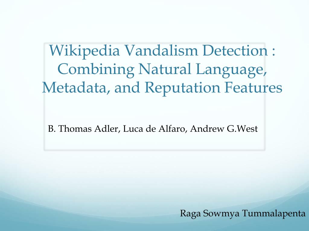 Wikipedia Vandalism Detection : Combining Natural Language, Metadata, and Reputation Features B. Thomas Adler, Luca de Alfaro, Andrew G.West Raga Sowmya Tummalapenta