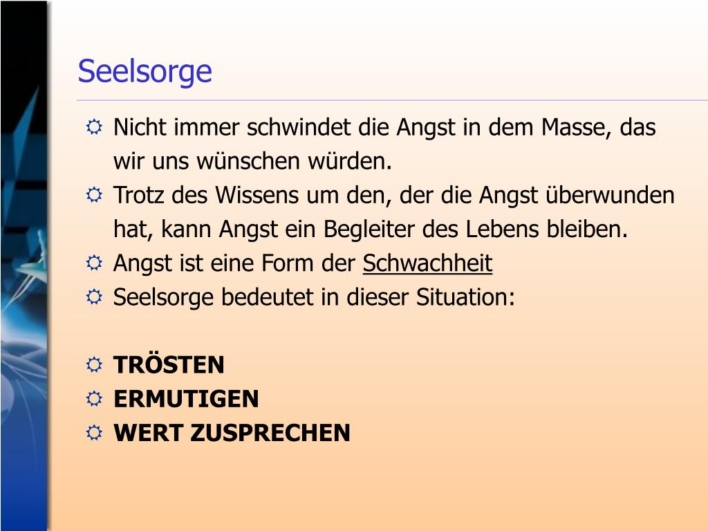 Seelsorge • Nicht immer schwindet die Angst in dem Masse, das wir uns wünschen würden. • Trotz des Wissens um den, der die Angst überwunden hat, kann Angst ein Begleiter des Lebens bleiben. • Angst ist eine Form der Schwachheit • Seelsorge bedeutet in dieser Situation: • TRÖSTEN • ERMUTIGEN • WERT ZUSPRECHEN