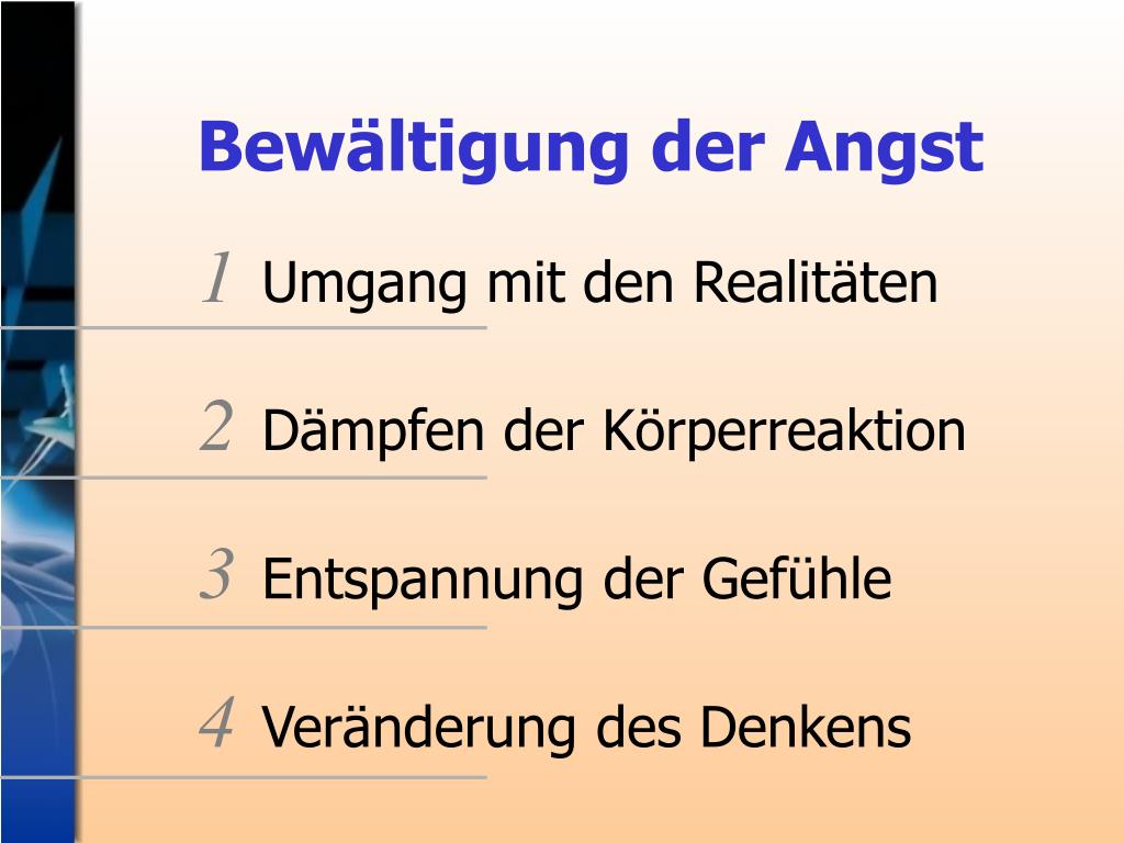 Bewältigung der Angst 1Umgang mit den Realitäten 2Dämpfen der Körperreaktion 3Entspannung der Gefühle 4Veränderung des Denkens