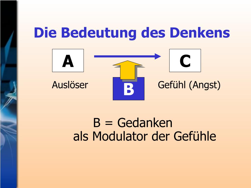 Die Bedeutung des Denkens A C Auslöser B Gefühl (Angst) B = Gedanken als Modulator der Gefühle