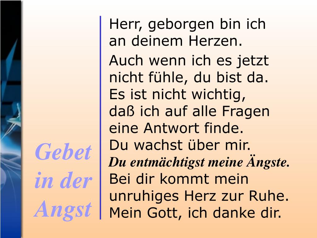 Herr, geborgen bin ich an deinem Herzen. Auch wenn ich es jetzt nicht fühle, du bist da. Es ist nicht wichtig, daß ich auf alle Fragen eine Antwort finde. Du wachst über mir. Du entmächtigst meine Ängste. Bei dir kommt mein unruhiges Herz zur Ruhe. Mein Gott, ich danke dir. Gebet in der Angst