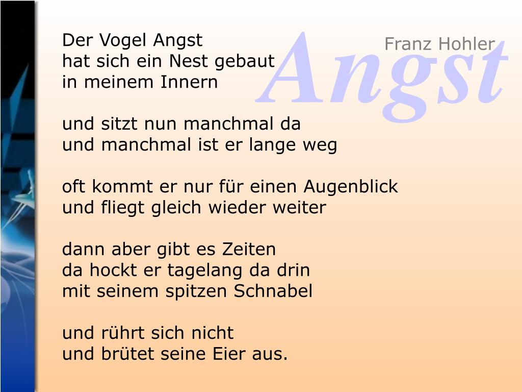 Angst Der Vogel Angst hat sich ein Nest gebaut in meinem Innern und sitzt nun manchmal da und manchmal ist er lange weg oft kommt er nur für einen Augenblick und fliegt gleich wieder weiter dann aber gibt es Zeiten da hockt er tagelang da drin mit seinem spitzen Schnabel und rührt sich nicht und brütet seine Eier aus. Franz Hohler