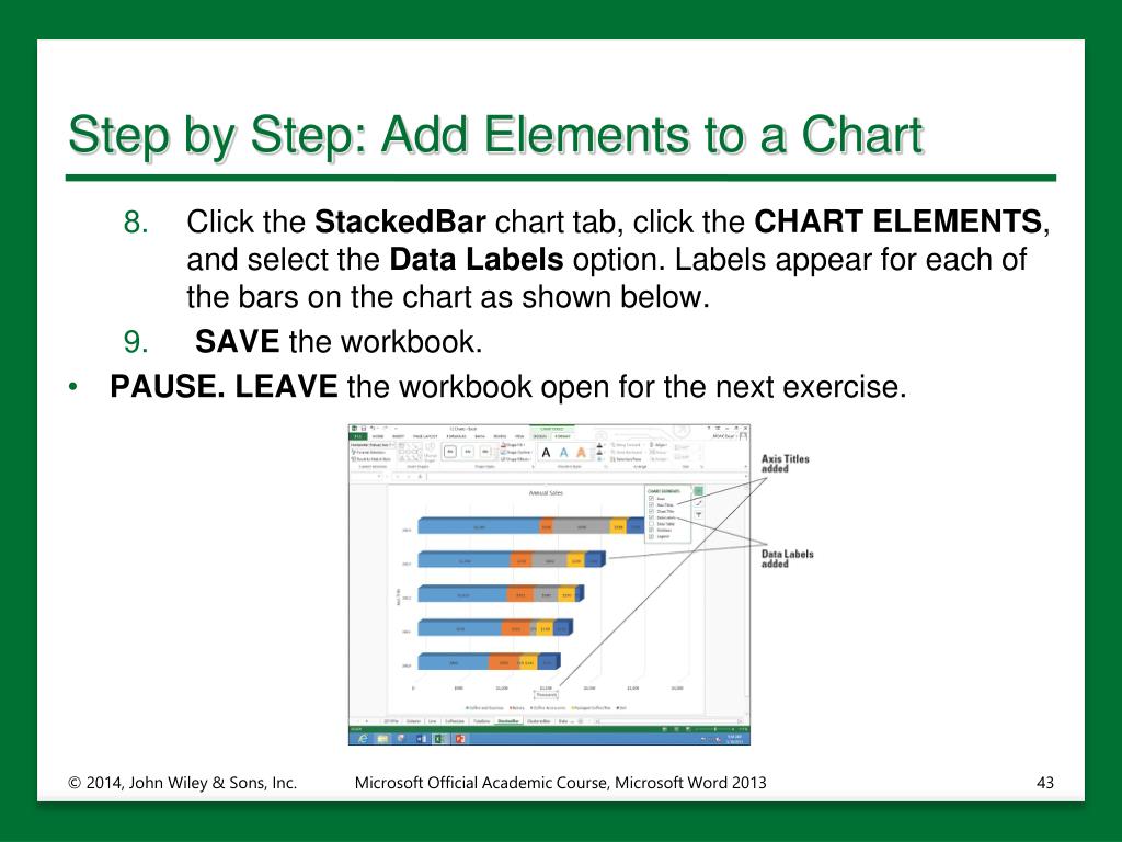 Step by Step: Add Elements to a Chart • Click the StackedBar chart tab, click the CHART ELEMENTS, and select the Data Labels option. Labels appear for each of the bars on the chart as shown below. • SAVE the workbook. • PAUSE. LEAVE the workbook open for the next exercise. Microsoft Official Academic Course, Microsoft Word 2013