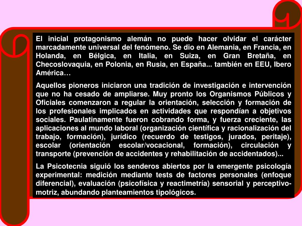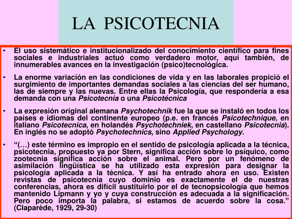 LA PSICOTECNIA • El uso sistemático e institucionalizado del conocimiento científico para fines sociales e industriales actuó como verdadero motor, aquí también, de innumerables avances en la investigación (psico)tecnológica. • La enorme variación en las condiciones de vida y en las laborales propició el surgimiento de importantes demandas sociales a las ciencias del ser humano, las de siempre y las nuevas. Entre ellas la Psicología, que respondería a esa demanda con una Psicotecnia o una Psicotécnica • La expresión original alemana Psychotechnik fue la que se instaló en todos los países e idiomas del continente europeo (p.e. en francés Psicotechnique, en italiano Psicotecnica, en holandés Psychotechniek, en castellano Psicotecnia). En inglés no se adoptó Psychotechnics, sino Applied Psychology. • “(…) este término es impropio en el sentido de psicología aplicada a la técnica, psicotecnia, propuesto ya por Stern, significa acción sobre lo psíquico, como zootecnia significa acción sobre el animal. Pero por un fenómeno de asimilación lingüística se ha utilizado esta expresión para designar la psicología aplicada a la técnica. Y así ha entrado ahora en uso. Existen revistas de psicotecnia cuyo dominio es exactamente el de nuestras conferencias, ahora es difícil sustituirlo por el de tecnopsicología que hemos mantenido Lipmann y yo y cuya construcción es adecuada a la significación. Pero poco importa la palabra, si estamos de acuerdo sobre la cosa.” (Claparède, 1929, 29-30)