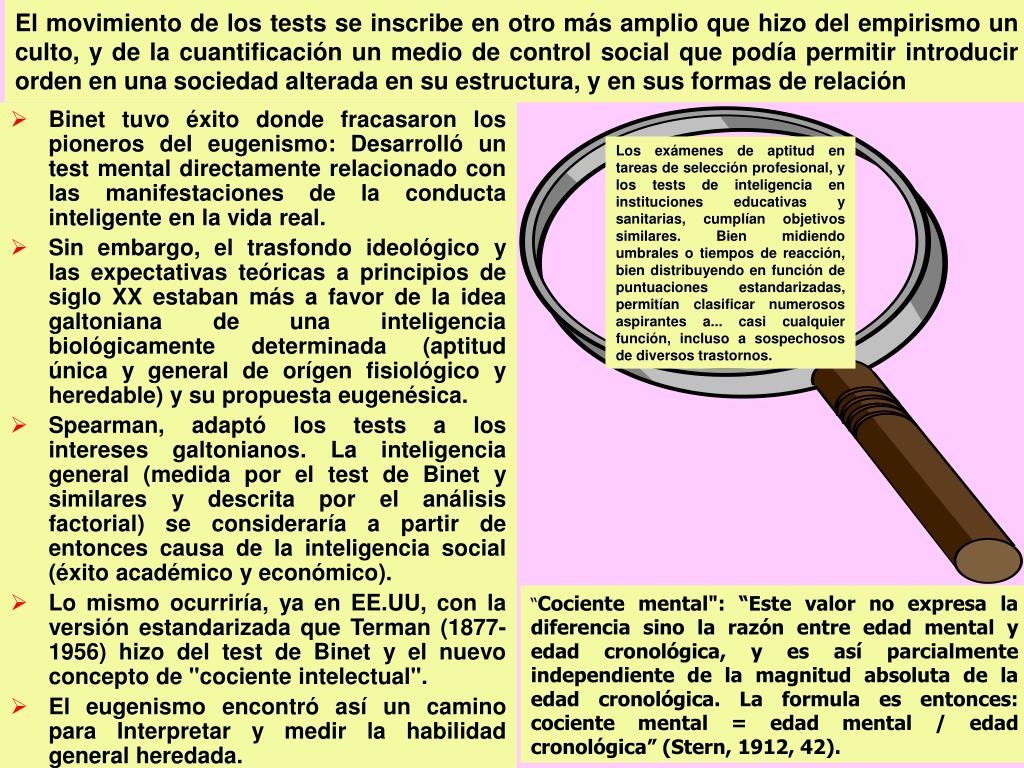 El movimiento de los tests se inscribe en otro más amplio que hizo del empirismo un culto, y de la cuantificación un medio de control social que podía permitir introducir orden en una sociedad alterada en su estructura, y en sus formas de relación • Binet tuvo éxito donde fracasaron los pioneros del eugenismo: Desarrolló un test mental directamente relacionado con las manifestaciones de la conducta inteligente en la vida real. • Sin embargo, el trasfondo ideológico y las expectativas teóricas a principios de siglo XX estaban más a favor de la idea galtoniana de una inteligencia biológicamente determinada (aptitud única y general de orígen fisiológico y heredable) y su propuesta eugenésica. • Spearman, adaptó los tests a los intereses galtonianos. La inteligencia general (medida por el test de Binet y similares y descrita por el análisis factorial) se consideraría a partir de entonces causa de la inteligencia social (éxito académico y económico). • Lo mismo ocurriría, ya en EE.UU, con la versión estandarizada que Terman (1877-1956) hizo del test de Binet y el nuevo concepto de "cociente intelectual". • El eugenismo encontró así un camino para Interpretar y medir la habilidad general heredada. Los exámenes de aptitud en tareas de selección profesional, y los tests de inteligencia en instituciones educativas y sanitarias, cumplían objetivos similares. Bien midiendo umbrales o tiempos de reacción, bien distribuyendo en función de puntuaciones estandarizadas, permitían clasificar numerosos aspirantes a... casi cualquier función, incluso a sospechosos de diversos trastornos. “Cociente mental": “Este valor no expresa la diferencia sino la razón entre edad mental y edad cronológica, y es así parcialmente independiente de la magnitud absoluta de la edad cronológica. La formula es entonces: cociente mental = edad mental / edad cronológica” (Stern, 1912, 42).