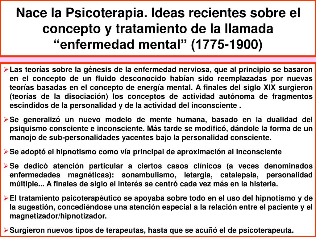 Nace la Psicoterapia. Ideas recientes sobre el concepto y tratamiento de la llamada “enfermedad mental” (1775-1900) • Las teorías sobre la génesis de la enfermedad nerviosa, que al principio se basaron en el concepto de un fluido desconocido habían sido reemplazadas por nuevas teorías basadas en el concepto de energía mental. A finales del siglo XIX surgieron (teorías de la disociación) los conceptos de actividad autónoma de fragmentos escindidos de la personalidad y de la actividad del inconsciente . • Se generalizó un nuevo modelo de mente humana, basado en la dualidad del psiquismo consciente e inconsciente. Más tarde se modificó, dándole la forma de un manojo de sub-personalidades yacentes bajo la personalidad consciente. • Se adoptó el hipnotismo como vía principal de aproximación al inconsciente • Se dedicó atención particular a ciertos casos clínicos (a veces denominados enfermedades magnéticas): sonambulismo, letargia, catalepsia, personalidad múltiple... A finales de siglo el interés se centró cada vez más en la histeria. • El tratamiento psicoterapéutico se apoyaba sobre todo en el uso del hipnotismo y de la sugestión, concediéndose una atención especial a la relación entre el paciente y el magnetizador/hipnotizador. • Surgieron nuevos tipos de terapeutas, hasta que se acuñó el de psicoterapeuta.